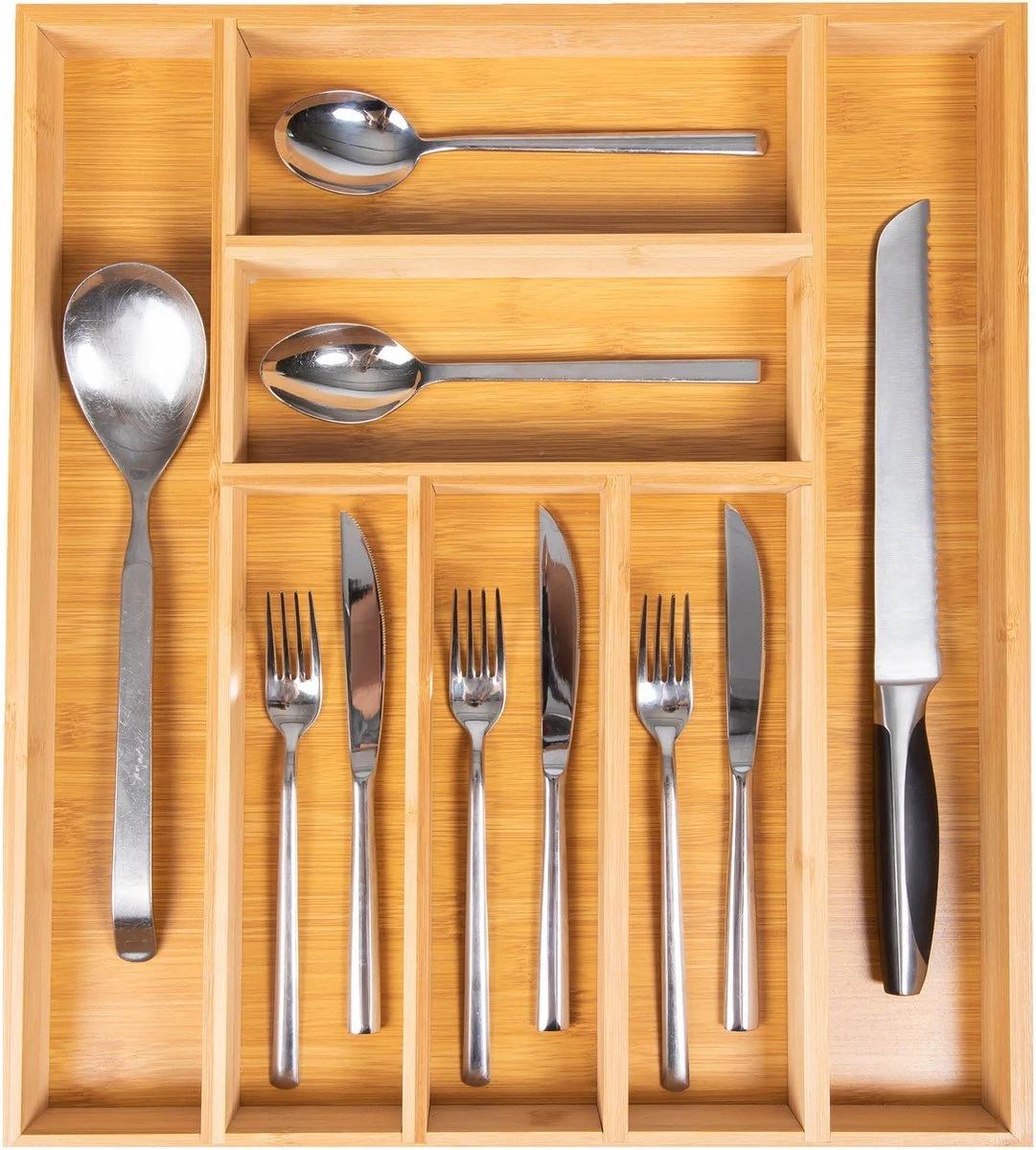 De bestekbak is zeer slijtvast door het zeer sterke bamboe hout en geeft een goede bescherming voor de voorwerpen die in de organizer geplaatst zullen worden. Bij de normale bestekbakken zal ongetwijfeld voorkomen dat de messen door het plastic heen prikken of dat de kwaliteit na enkele weken afneemt. Dit probleem heb je niet met de bamboe bestekbak.