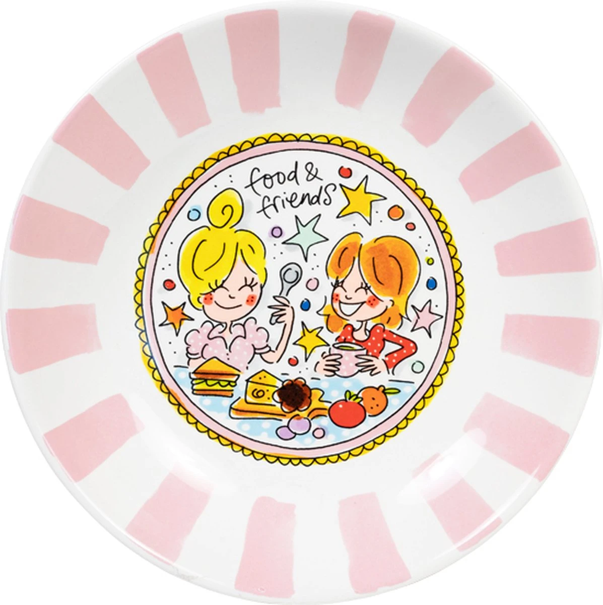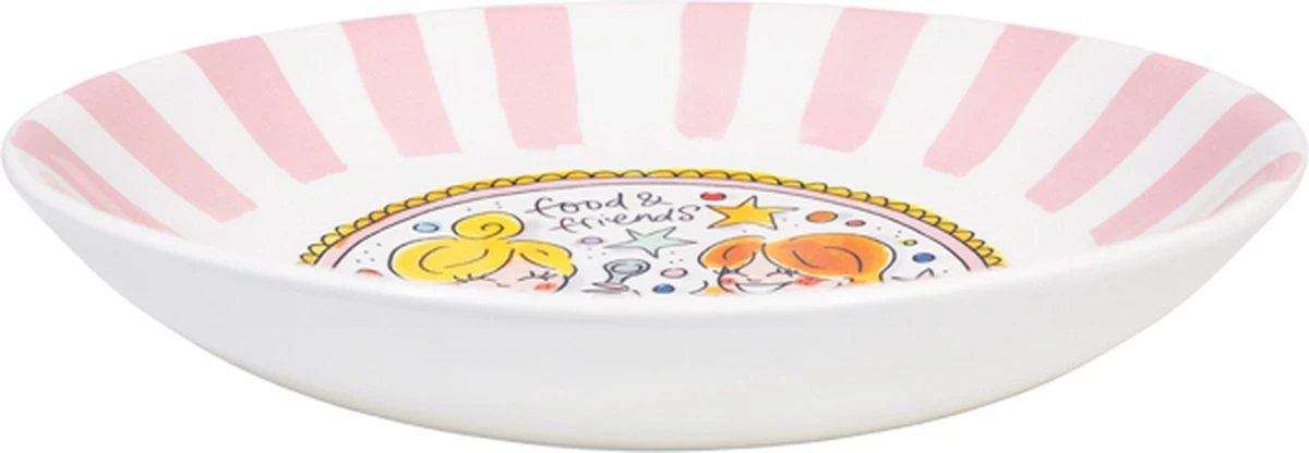“Blond Amsterdam heeft aan de populaire collectie Even Bijkletsen nieuwe diepe borden toegevoegd. Een van deze borden is een mix van de kenmerkende illustraties en roze strepen. Het bord is perfect voor zelfgemaakte soepen, salades of warme gerechten. Er gaat niets boven good food with good friends!