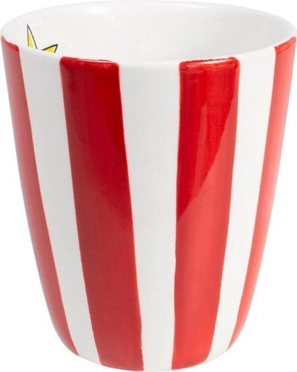 De collectie Even Bijkletsen is uitgebreid met nieuwe items. Dit keer niet met de kenmerkende illustraties, maar met kleurrijke strepen. Dit servies is leuk te combineren met het reguliere Even Bijkletsen servies of juist ook leuk om te combineren met een andere collecties. Deze beker bestaat uit een rode streep met wit. Aan de binnenkant van deze beker komt de ster weer terug. Deze beker kan je leuk combineren met de andere nieuwe producten met sterren en of strepen of je kan het leuk combineren met het reguliere servies van Blond Amsterdam.
