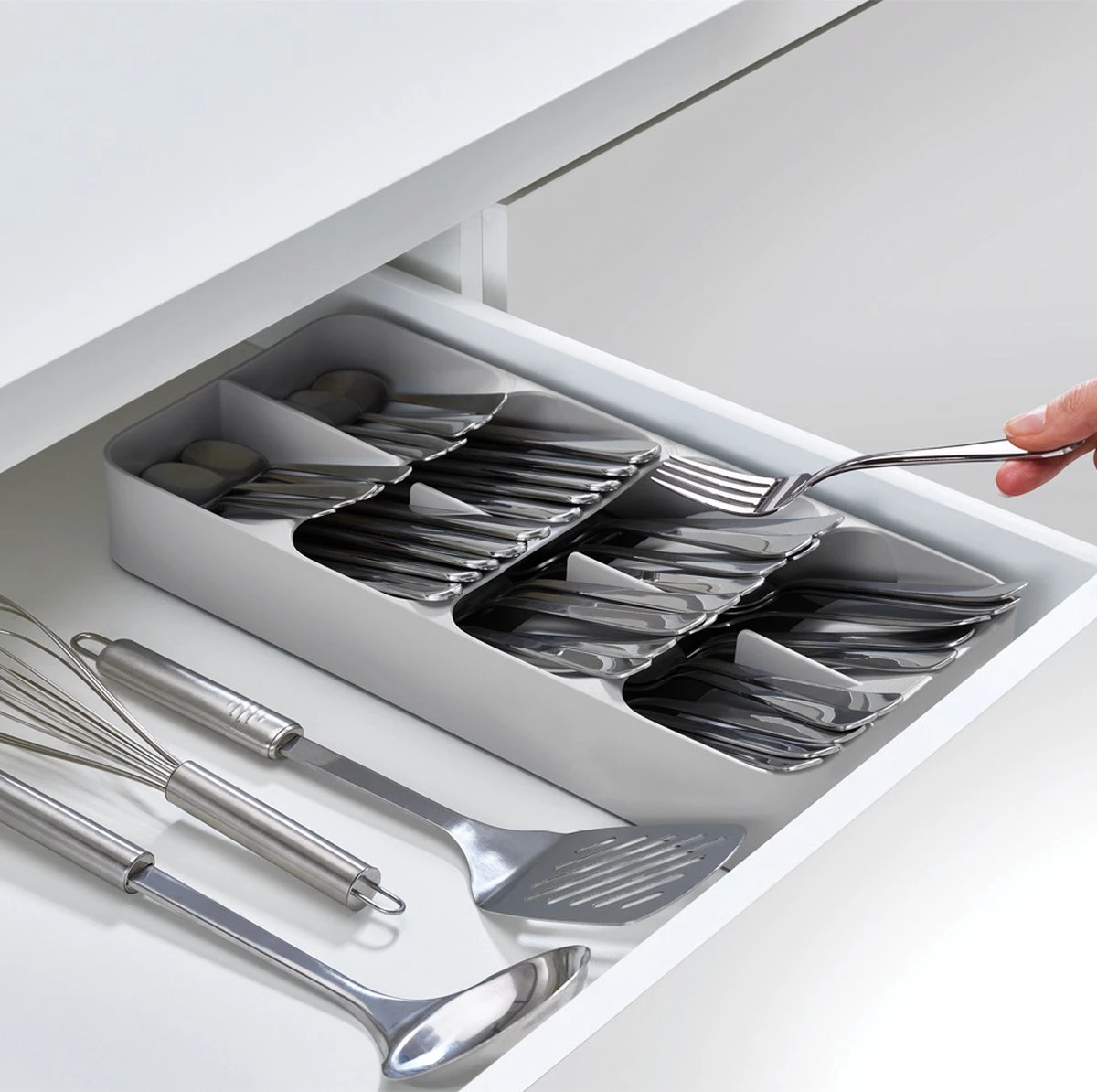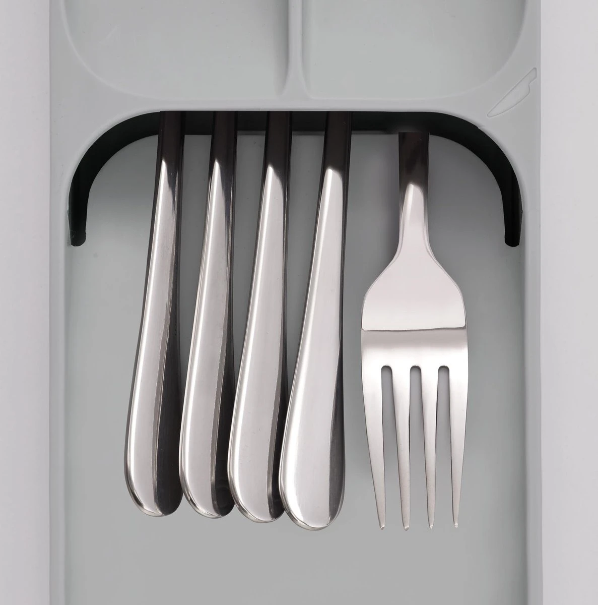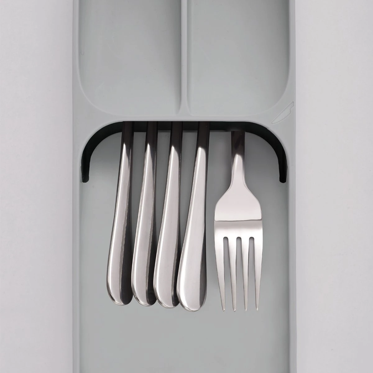Met deze bestekbak van het merk Joseph Joseph kun je de ruimte in je keukenlade optimaal benutten – ideaal voor kleine keukens! De unieke constructie van deze keukenlade organizer creëert ruimte voor messen, vorken en lepels die in conventionele bestekdozen minstens twee keer zoveel ruimte nodig hebben.