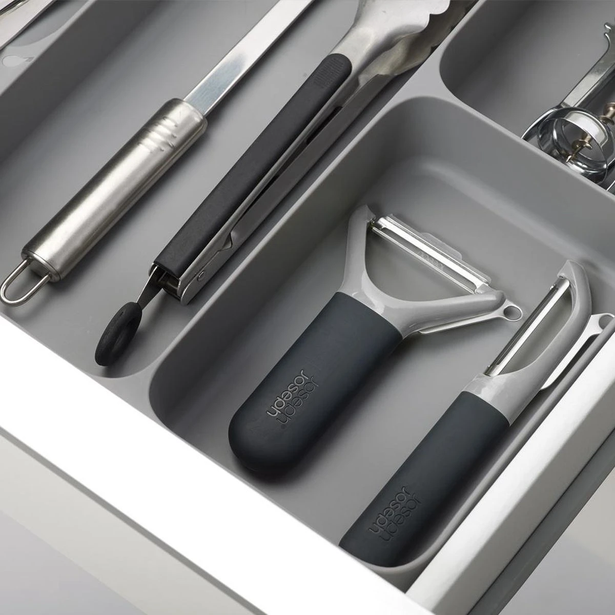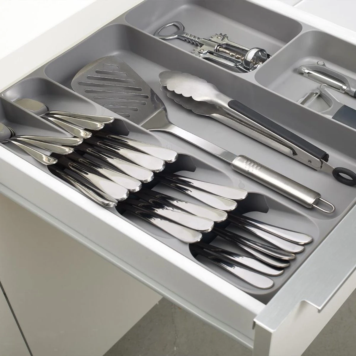Al je bestek handig op één plek met deze bestekbak van het merk Joseph Joseph. Door het unieke design van deze keukenlade organizer creëer je extra ruimte om al je bestek, keukengerei en keukenaccessoires netjes te sorteren. Het stijlvolle design past goed bij iedere keuken.