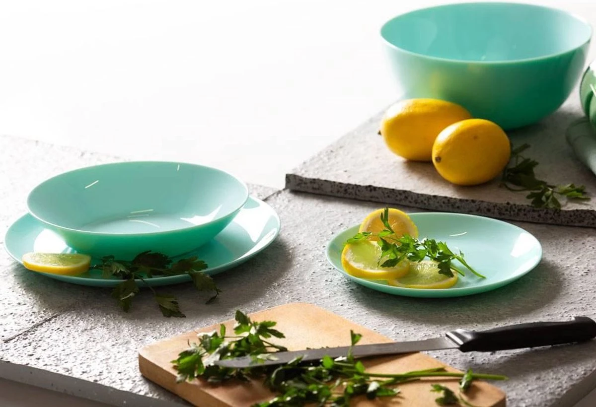 Eenvoud en tijdloosheid, dat is de charme van de Diwali collectie van Luminarc. De pure lijnen van deze borden benadrukken het gerecht van de chef en zorgen voor een luchtige, eigentijdse tafeldekking. Het servies is gemaakt uit getemperd glas en is extra stevig. Deze 19-delige set bestaat uit 6 platte borden, 6 diepbe borden, 6 dessertborden en een kom.