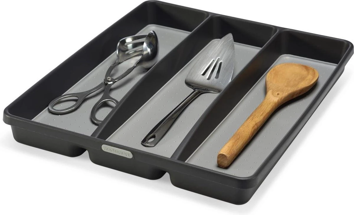 Op zoek naar de ideale manier om jouw keukengerei te organiseren? Met de Madesmart bestekbak – 3 vakken – Antraciet heb je altijd nette en overzichtelijke keukenlades. Deze besteklade beschikt over drie compartimenten, perfect voor bijvoorbeeld spatels, scharen en opscheplepels. De soft-grip voering beschermt tegen krassen en houdt alles netjes op zijn plek.
