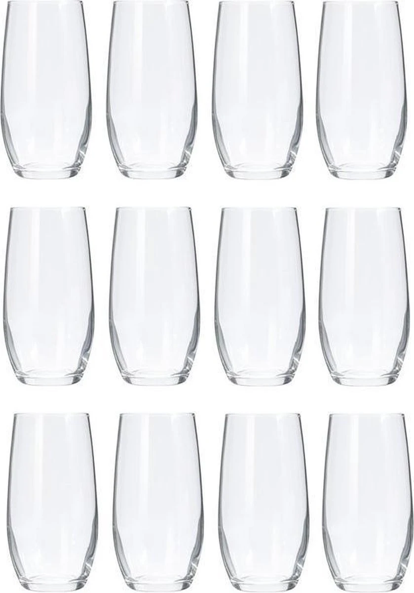 12x Verzwaarde luxe sap glazen met een inhoud van 360ml. Afmeting: ca. 5 x 14 cm. De glazen zijn geschikt voor in de vaatwasser.