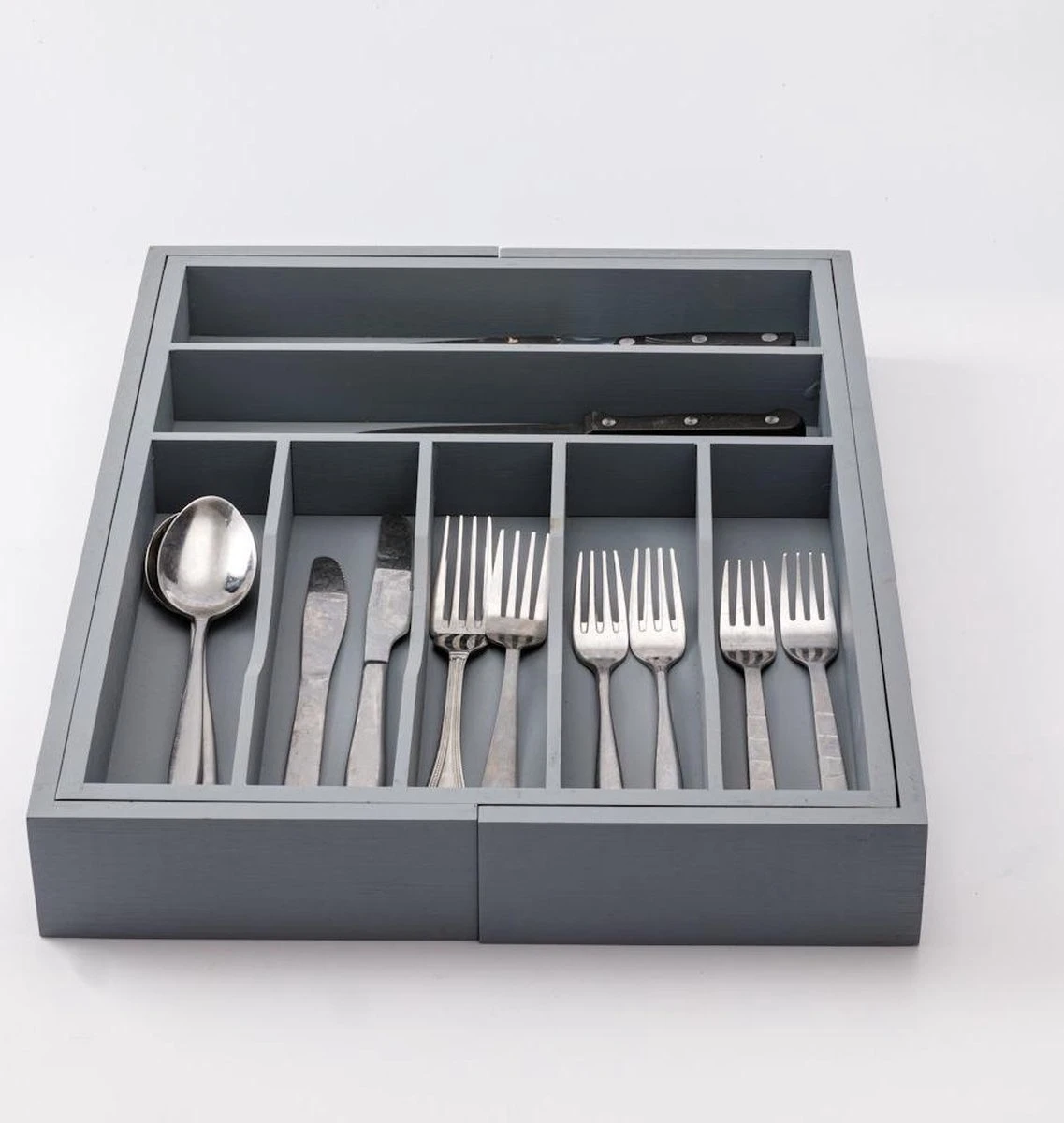 De bestekbak is eenvoudig uitschuifbaar. Zo pas je hem aan je wensen aan. Door de bestekbak uit te schuiven creëer je aan beide zijdes een vak extra. Als je de zijkanten uitschuift heb je bestekbak met 9 vakken. Genoeg ruimte voor al je bestek!
