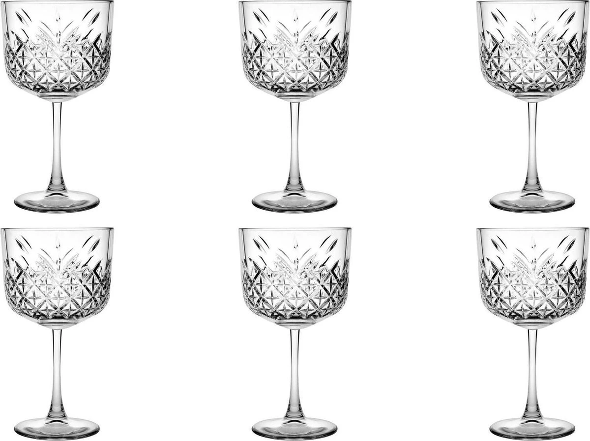 Deze prachtige Timeless gin tonicglazen zijn zeer geschikt voor het schenken van diverse soorten gin tonics. Maar ook andere cocktails zullen perfect staan in deze glazen. Deze glazen maken met hun opvallende gehoekte glasbewerking en hoge vrouwelijke steel iedere drank bijzonder. Deze elegante glazen zijn gemaakt van extreem sterk glas en zijn perfect voor een feestje en dagelijks gebruik. En na gebruik kunnen deze glazen gereinigd worden in de vaatwasmachine. Deze set bestaat uit 6 gin tonicglazen met een inhoudsmaat van 55 cl.