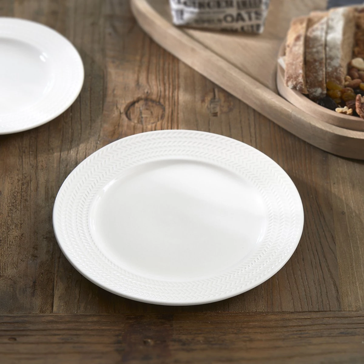 Wat opvalt aan dit dinerbord uit de RM Bellecôte serviesserie is de sierrand die gevlochten lijkt te zijn in een mooie visgraat. Een rustig decor, waardoor alle aandacht kan gaan naar de heerlijke maaltijd op het bord. Komt goed tot zijn recht op een mooi gekleurd tafellaken.