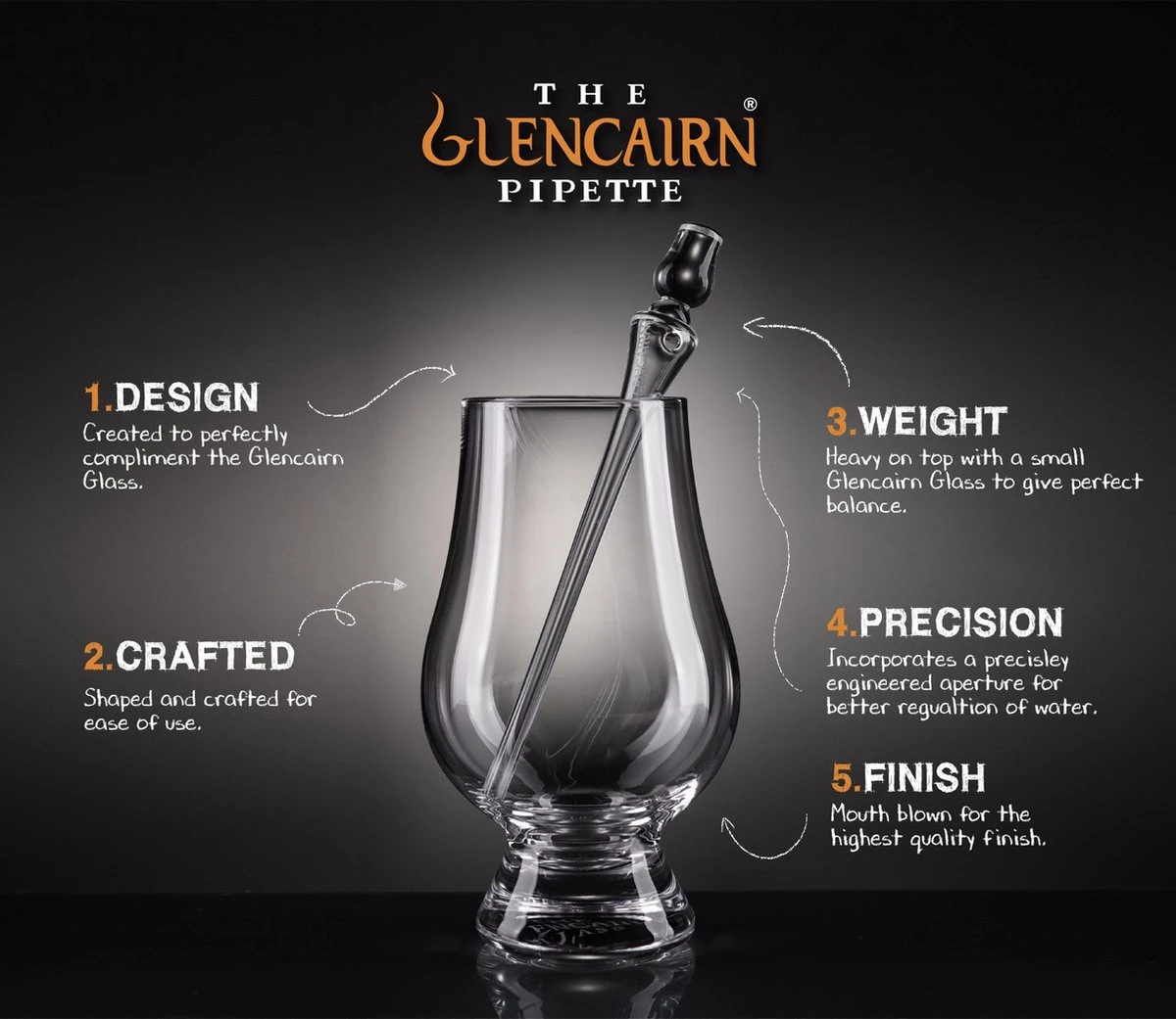 De, met de hand geblazen, glazen Glencairn Pipet is ontworpen op de ideale lengte voor het Glencairn glas. De pipet ligt comfortabel in de hand met op de bovenkant een prachtige miniatuur van het Glencairn glas. Door de nauwkeurig ontworpen controle opening in de brede rand aan de bovenkant maakt het mogelijk een preciese dozering van de hoeveelheid water toe te voegen.